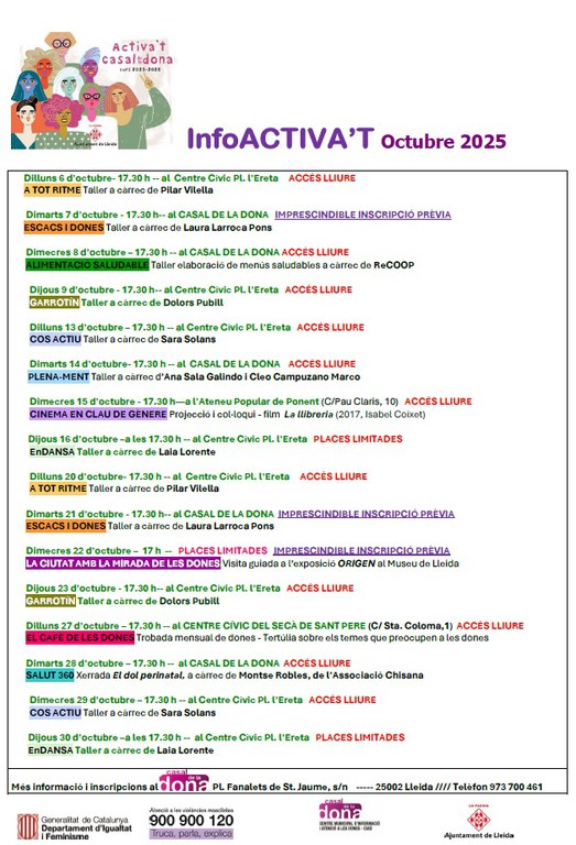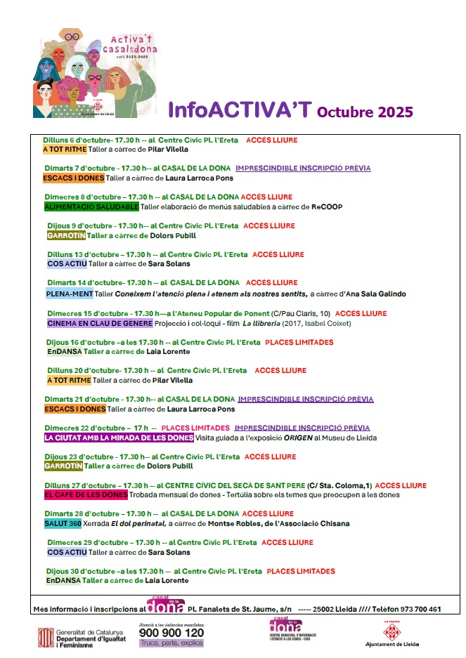 Programa de actividades, organizado por el Casal de la Dona - Concejalía de Políticas Feministas, que ofrece una amplia gama de talleres dirigidos a todas las mujeres del municipio de Lleida. Todas las actividades tienen como objetivo promover la salud, el bienestar, la fortaleza y el crecimiento personal, la difusión y defensa de los derechos de las mujeres, el empoderamiento y el liderazgo femenino, la prevención de la violencia machista y el impulso del asociacionismo femenino.